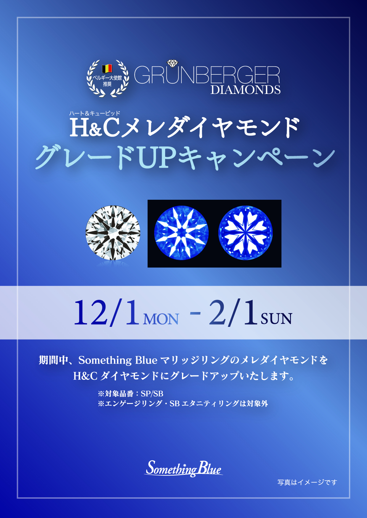 期間中、Something Blue(サムシングブルー)マリッジリングのメレダイヤモンドをH&C(ハート&キューピッド)ダイヤモンドにグレードアップいたします!